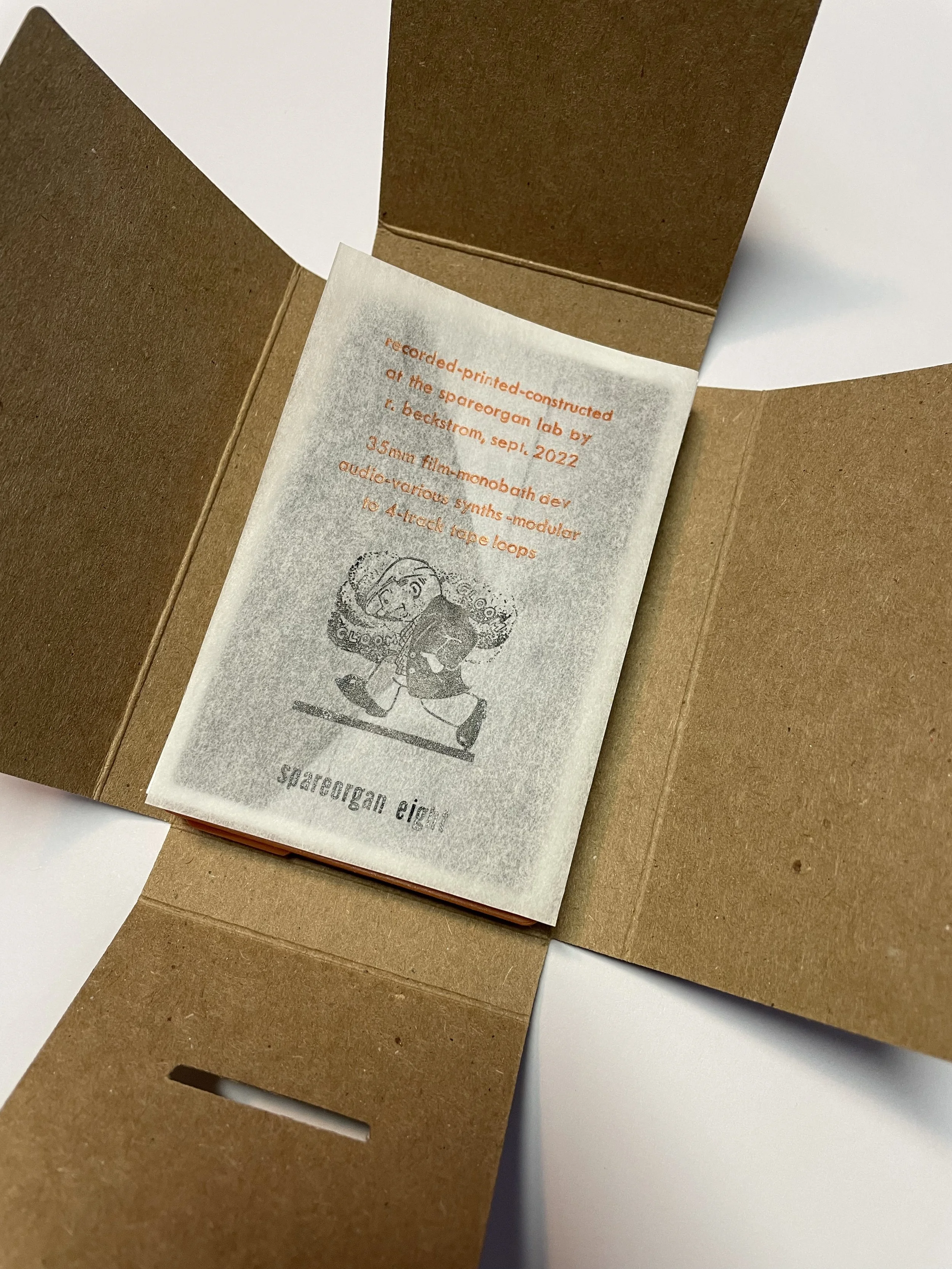 Five tracks total of analog 4-track tape loops. Loop tapes were recorded using a TE OP-1, Eurorack Modular system, and a Roland JX-08 processed through various effect pedals. Covers and insert were letterpress printed on die-cut chipboard cases and tracing paper. Contains a selection of 4 of 8 different 35mm photo inkjet prints taken and monobath developed by r. beckstrom.